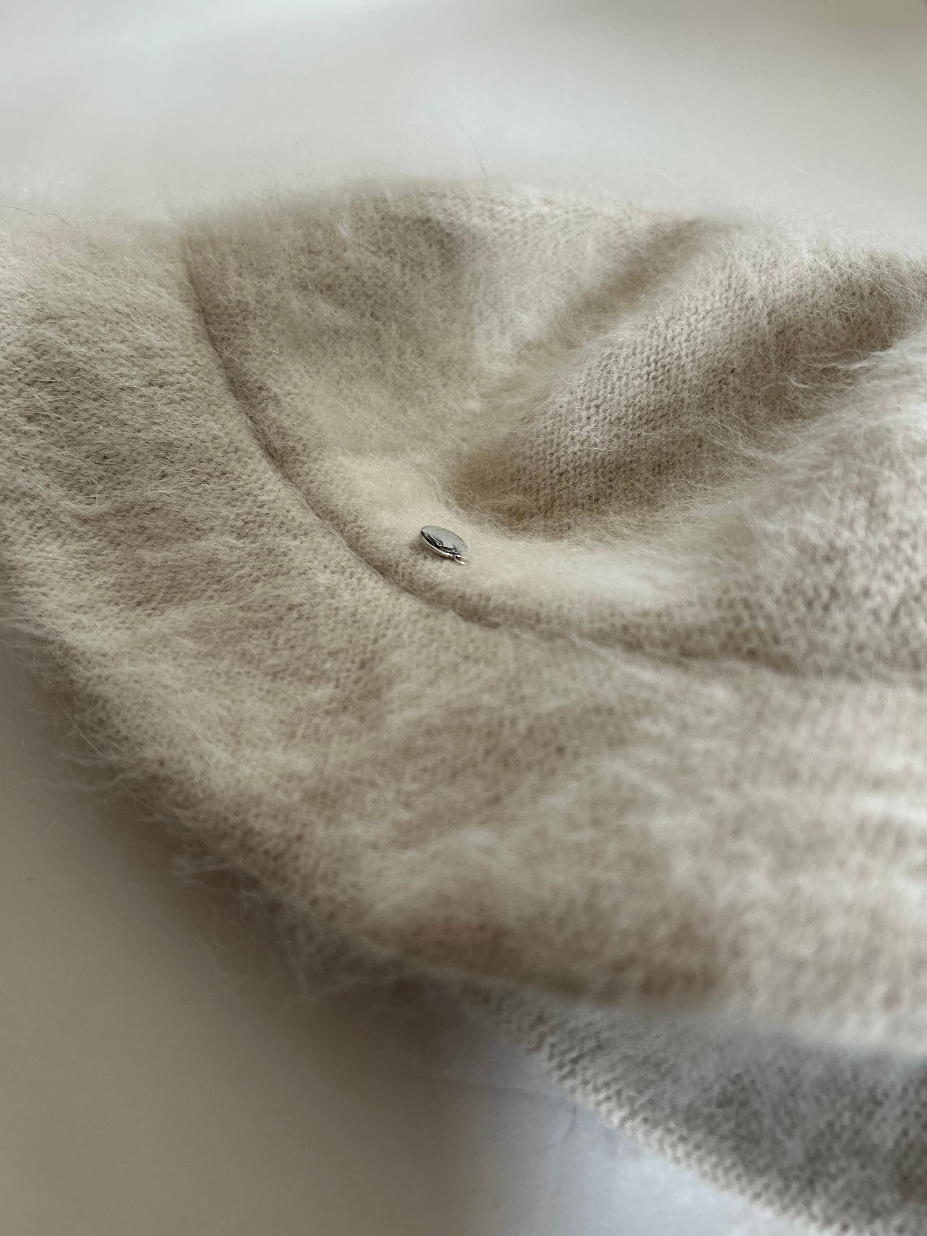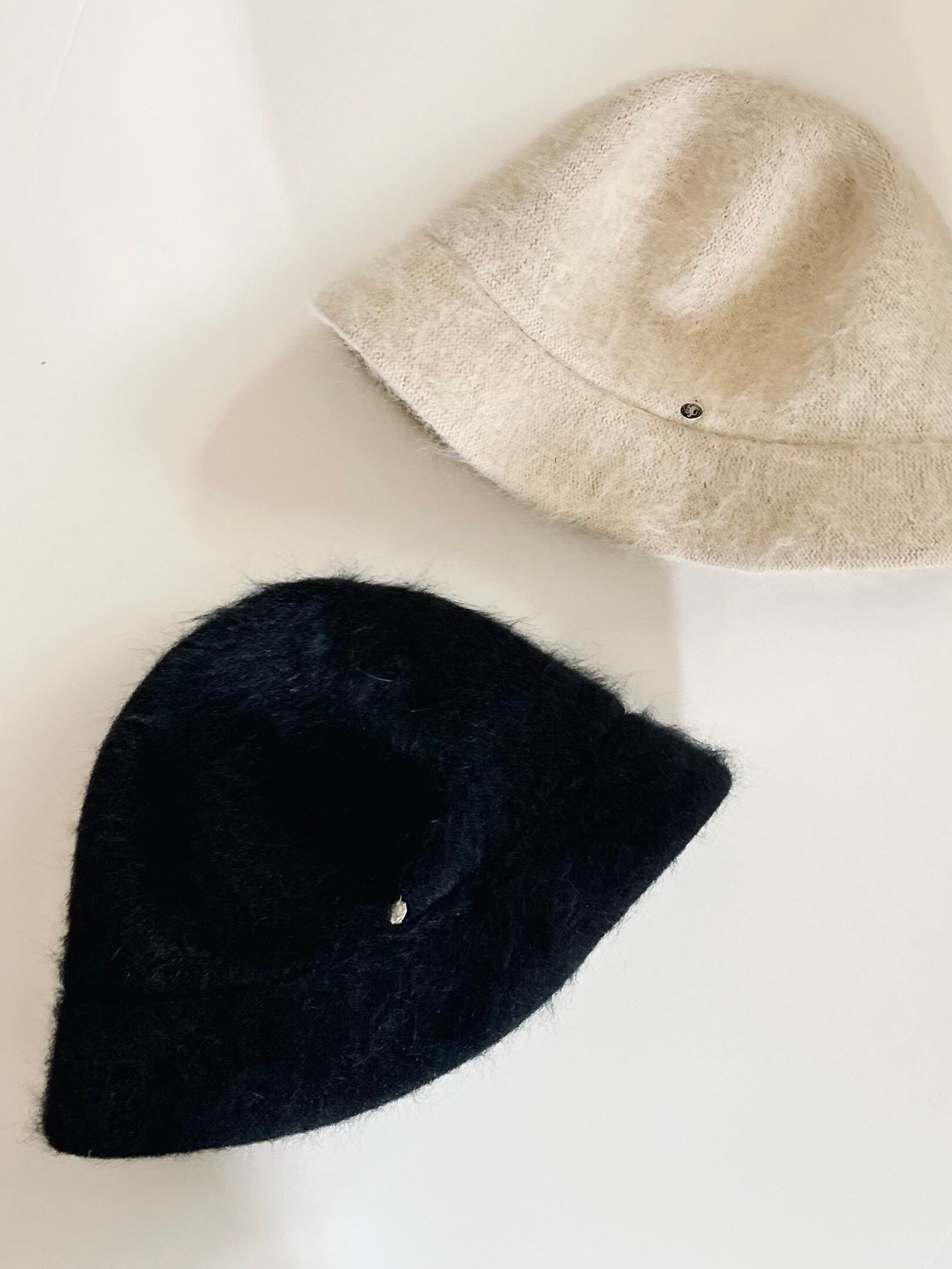 アンゴラ毛糸と特殊なポリエステル糸を合わせ、ニット後に熱による立体成形の工程を加え、柔らかさがありながら、へたりにくい立体的なシルエットに。また、ニット後の毛かき作業を手作業で行うことで、アンゴラの毛足をふわっとさせ、見た目にも暖かさを感じる帽子です。