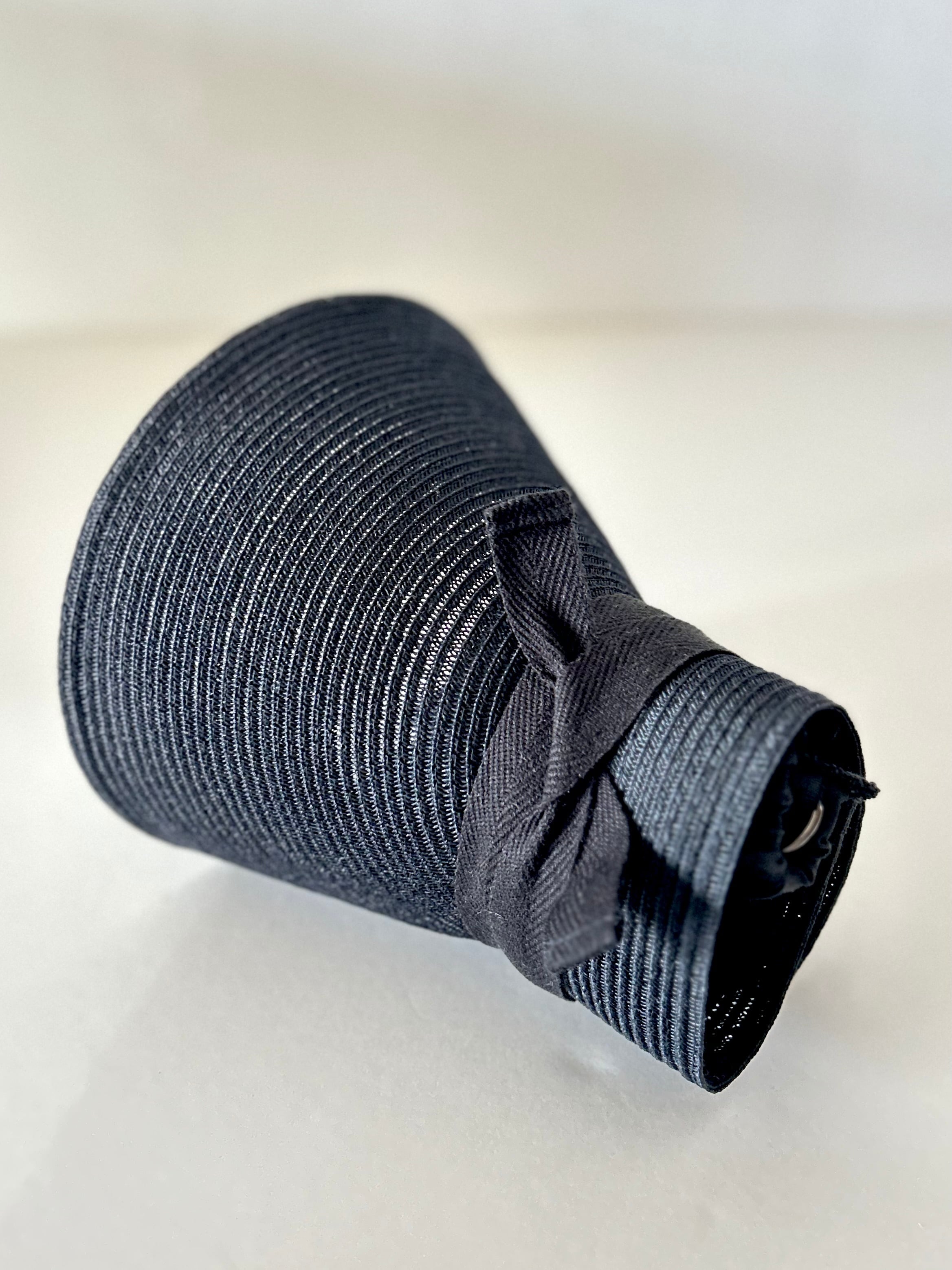 使用したのは国産のポリエステルブレード。張り感とほどよい艶のある細ブレードを、国内で丁寧に縫製しました。ワイドなブリムでも軽やかで、ブレードならではのほんのりした透け感が涼しげです。