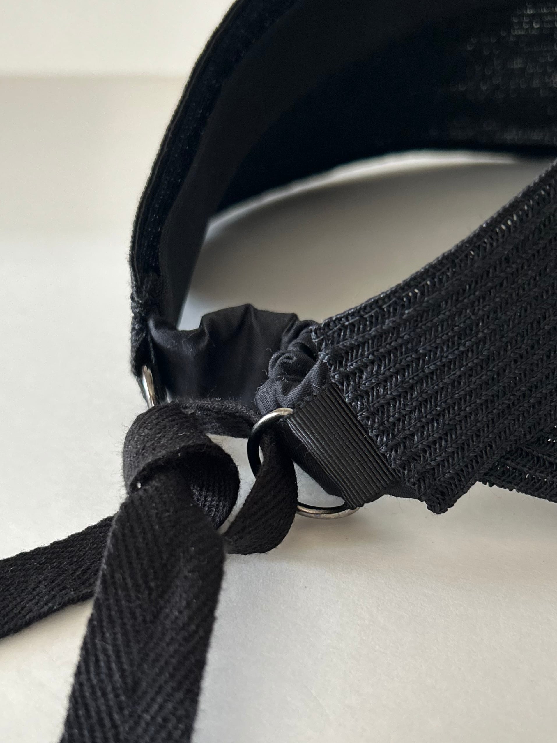 後ろ部分ははシャーリングゴム仕立て、さらに、セットの黒いリボンでサイズ調整可能です。