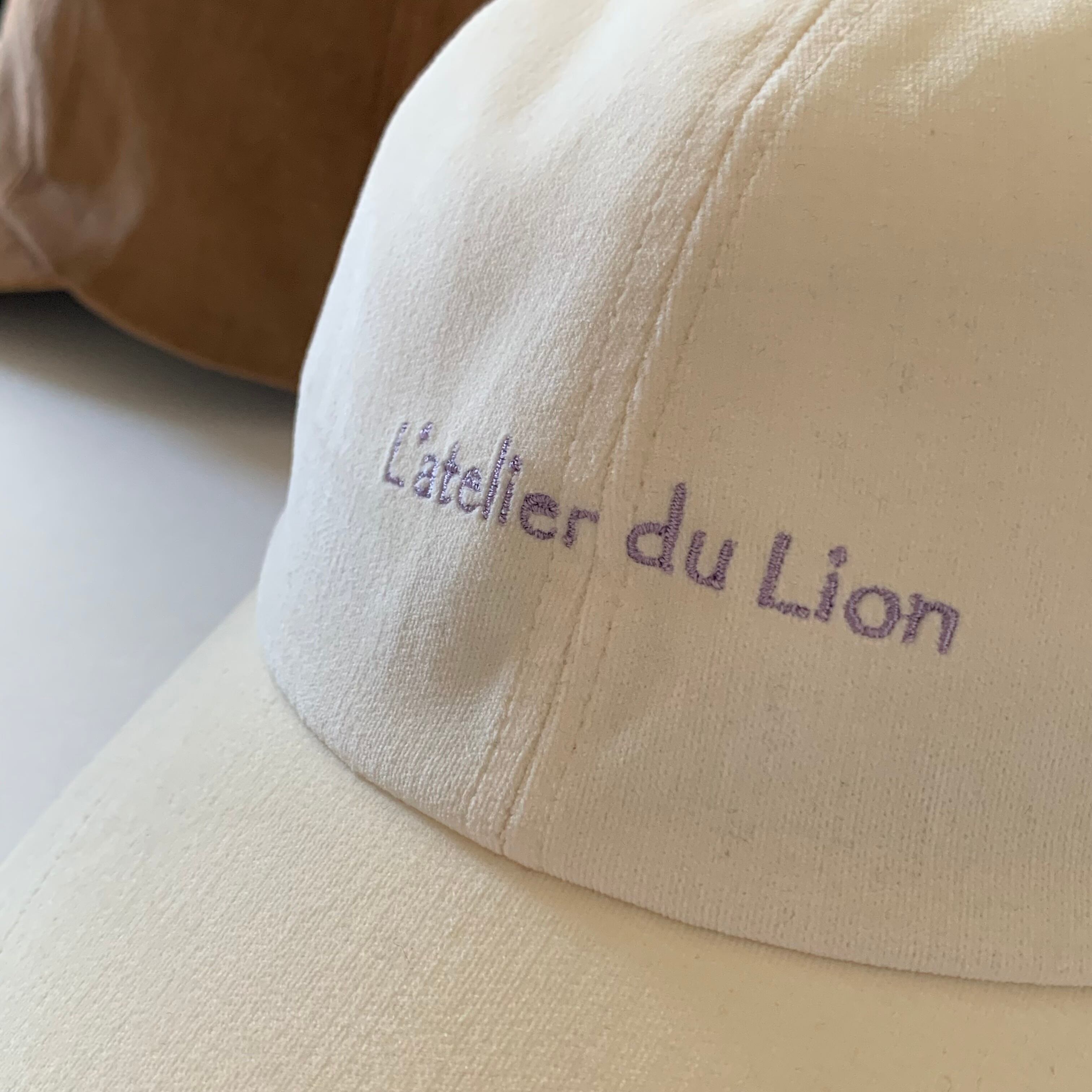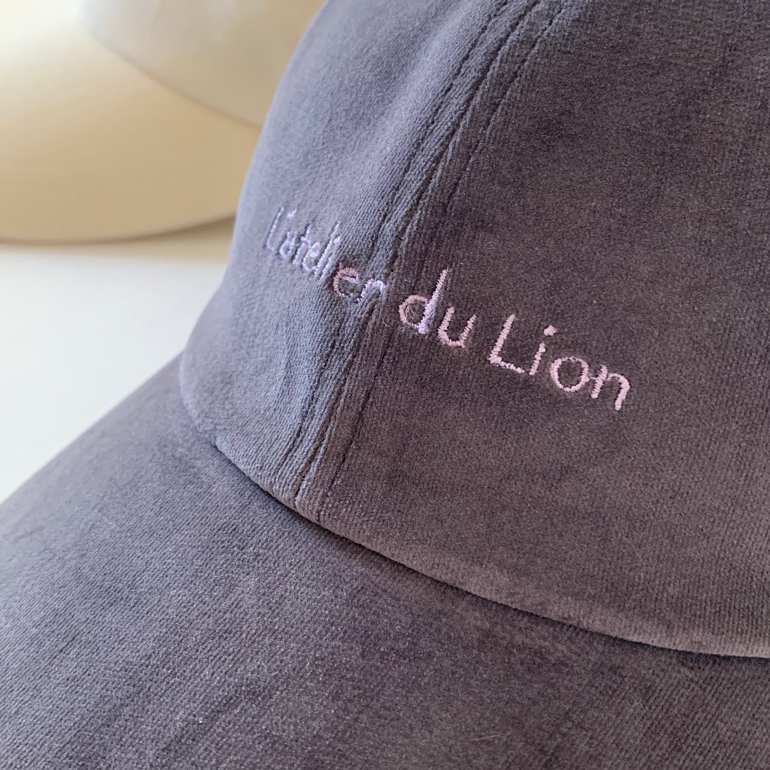 ライオンオリジナルパターン。フロントにブランドロゴ『L'atelier du Lion 』の刺繍入りです。刺繍カラーはライラックで統一しました♪